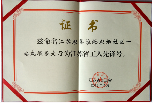 近日,省總工會(huì)授予江蘇農(nóng)墾淮海農(nóng)場(chǎng)社區(qū)一站式服務(wù)大廳獲江蘇省“工人先鋒號(hào)”榮譽(yù)稱號(hào),這是淮海農(nóng)場(chǎng)社區(qū)首次獲此殊榮。