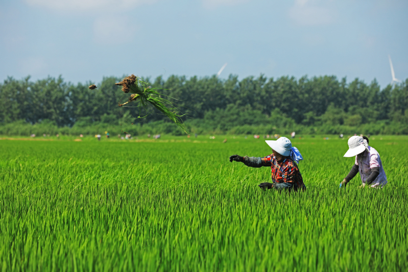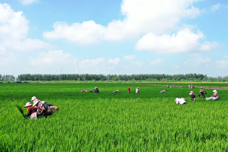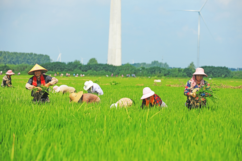 蘇墾農(nóng)發(fā)寶應(yīng)湖分公司擁有3500畝有機稻生產(chǎn)基地,該基地于2021年取得歐盟、國環(huán)雙認證。為保障有機稻質(zhì)量,每到夏季,公司都會組織進行人工拔“雜草稻”。高溫炙烤下,200多名勞動者揮汗如雨,為生產(chǎn)出“魚米之鄉(xiāng)”高質(zhì)量有機米貢獻力量。