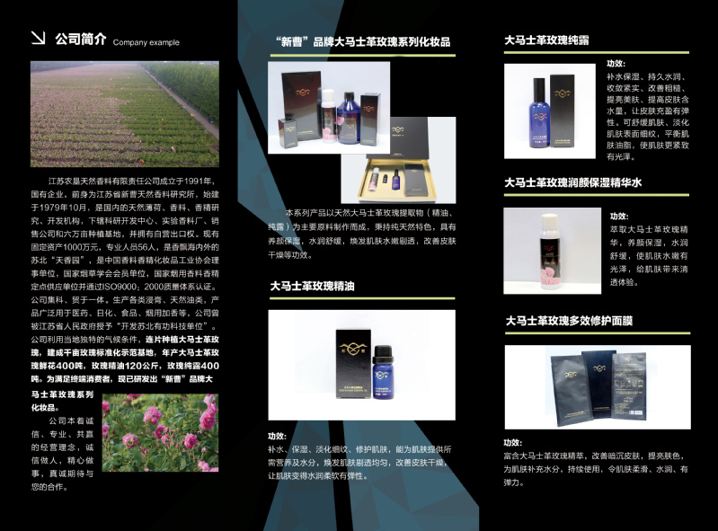 “新曹”牌大馬士革玫瑰系列產品:我公司與上海愛伽儷日用品公司聯(lián)姻,生產出“新曹”牌大馬士革玫瑰面膜、精華液、純露、復方精油系列化妝品。新曹香料人始終堅持產品高起點、高品質,工薪階層價格定位,深受北京、上海、廣東、深圳等一線城市消費者喜愛。