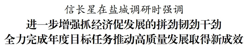 10月28日,省委書記信長星到鹽城市鹽都區(qū)、東臺市調(diào)研。他強調(diào),四季度是全年決勝階段,要深入學(xué)習(xí)貫徹習(xí)近平總書記重要講話精神,錨定年度目標(biāo)任務(wù),堅定信心、把握機遇,進(jìn)一步增強抓經(jīng)濟、促發(fā)展的拼勁、韌勁、干勁,推動高質(zhì)量發(fā)展取得新成效,努力為全省發(fā)展大局貢獻(xiàn)更大力量。