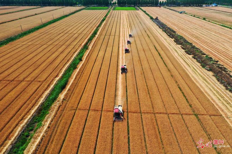 2025年6月4日,江蘇省連云港市海州區(qū)的江蘇農(nóng)墾崗埠農(nóng)場(chǎng)利用晴好天氣搶收成熟的小麥,現(xiàn)場(chǎng)五臺(tái)收割機(jī)一字排開,馳騁在金色的小麥田里,田間地頭一片繁忙豐收景象。(徐衛(wèi)攝)