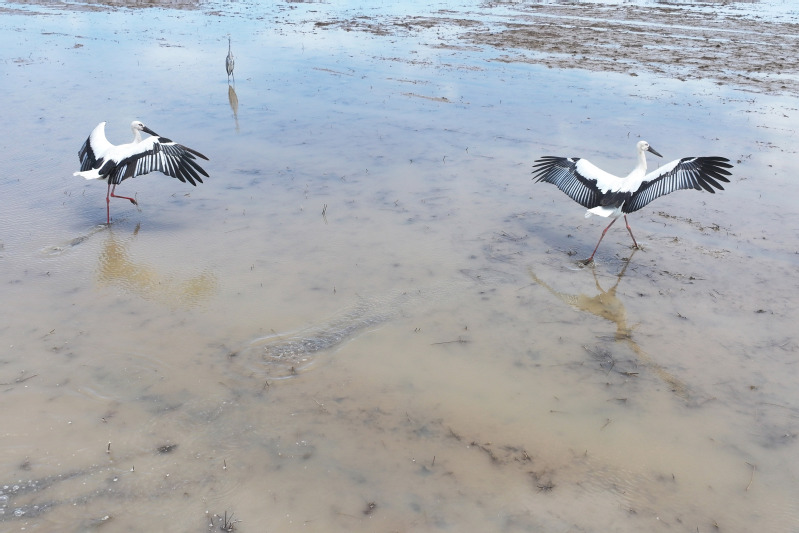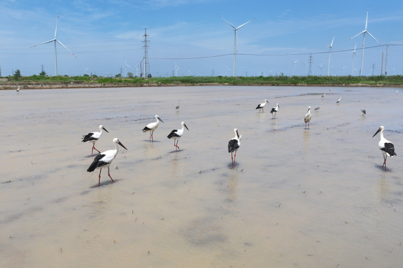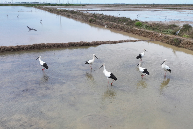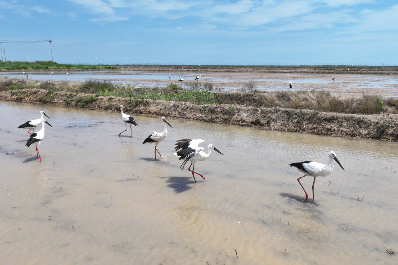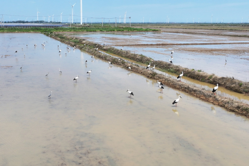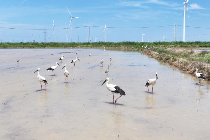 6月23日,江蘇省鹽城市射陽(yáng)縣臨海農(nóng)場(chǎng)順泰生產(chǎn)區(qū)的水田里,50余只國(guó)家一級(jí)保護(hù)動(dòng)物東方白鸛姿態(tài)優(yōu)雅,正悠然漫步、覓食,與水田的碧波相互映襯,構(gòu)成一幅靈動(dòng)的生態(tài)畫卷。