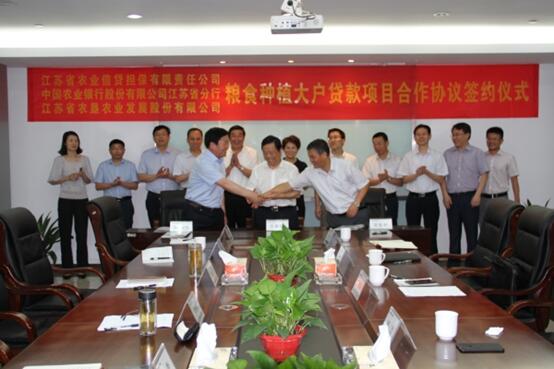 6月21日下午,蘇墾農發、省農行、省農擔公司在寧舉行全省糧食種植業大戶貸款項目合作簽約儀式。集團公司總經理、蘇墾農發董事長胡兆輝,省農行黨委副書記、副行長周吉,省農擔公司副總經理朱旭東出席并講話,