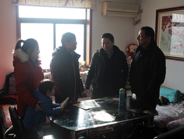 2月7日上午,集團公司紀委書記章朝陽一行到濱淮農場走訪慰問困難職工,農場黨委成員李德利、傅龍光、馬傳武陪同?! £惼际菫I淮農場四分場退休職工,兒子因車禍去世,后兒媳又離開了這個家庭,女兒也因婚姻問