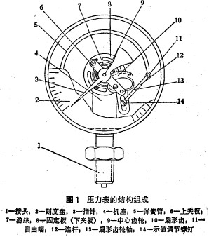 一船壓力表的主要部件有彈簧管、機(jī)芯、示值機(jī)構(gòu)、外殼等,關(guān)鍵部件有兩大件:一個(gè)是彈簧管,它是壓力表的感壓元件.將壓力變換成位移;一個(gè)是機(jī)芯,它是壓力表的心臟,能將彈簧管自由端的微小位移量放大,達(dá)到易于觀察讀數(shù)的程度.機(jī)芯部分包括中心齒輪、扇形齒輪、游絲、調(diào)節(jié)螺釘及連桿等零件.