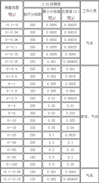 0.25級精密壓力表是一種按精度等級分類的稱謂, 0.25級是指該精密壓力表的精度等級, 標識其允許的最大示值基本誤差為其測量上限值的±0.25%. 通常將這種精密壓力表稱為0.25級精密壓力表。