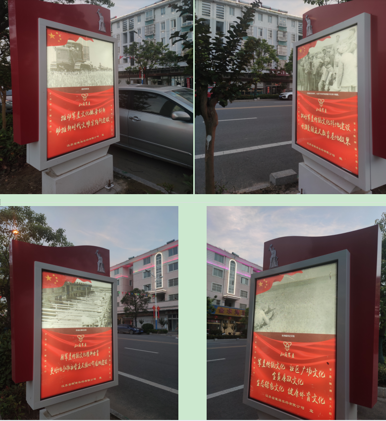 這些燈箱中,廣告燈箱的一面看到統一印制的建黨百年歷史的畫面外,在燈箱的另一面,除了印制江蘇農墾統一的LG標識和“不忘初心 繼續前行”“軍墾精神 薪火相傳”的細小字體外,還分別印有農建四師將士在農場“三大戰役”進程中開墾建設的不同老照片附說明,印有不同風格的軍墾傳統文化標語,并在畫面外的框架上,安裝了鑲嵌在其上的軍墾傳統文化的標志,濃郁的軍墾傳統文化在廣告燈箱中的完美組合,讓仍健在的老軍墾們甚是激動,說農場黨委以這種方式宣傳弘揚軍墾傳統文化,這是對他們建設農場最好的肯定。