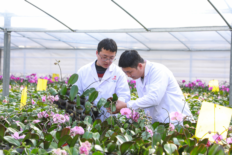 在云臺農(nóng)場興墾科技溫室蝴蝶蘭育苗基地,工作人員正在對區(qū)域內(nèi)蝴蝶蘭植株進行管護。作為高端觀賞花卉,蝴蝶蘭觀賞性強,市場價格較高,云臺農(nóng)場結(jié)合花卉培育,發(fā)展休閑觀光、研學(xué)體驗等項目吸引游客,為農(nóng)場帶來顯著的經(jīng)濟收益。此外,蝴蝶蘭培育需要精準的溫控、光照、組培技術(shù)等,云臺農(nóng)場興墾科技依托現(xiàn)代農(nóng)業(yè)科技,培育特色花卉,打造自有品牌,增強市場競爭力。目前,該基地現(xiàn)有大小苗蝴蝶蘭18萬株,品種包含紅蝴蝶、安娜、滿天紅等200多個品種。下一步,將把總株數(shù)擴大至60萬株,并于3月底完成蝴蝶蘭組培室搭建工作,為蝴蝶蘭組培苗技術(shù)研發(fā)和產(chǎn)業(yè)化生產(chǎn)銷售提供堅實基礎(chǔ)。