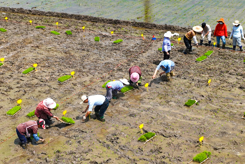端午假期第一天,蘇墾農(nóng)發(fā)南通分公司3大隊(duì)田頭一片忙碌景象。烈日下,7位農(nóng)技人員彎著腰在水稻田一字排開(kāi)移栽秧苗,腳下步履維艱、鼻頭汗珠滴落。按照隊(duì)伍兩頭農(nóng)技人員手拉的直線,他們小心翼翼地從秧盤(pán)上取下秧苗,左手握苗,右手插秧,確保行距25厘米,株距20厘米,每穴2株,橫豎成線、深度適中。每隔一段距離,田間都會(huì)插上一塊寫(xiě)明實(shí)驗(yàn)數(shù)據(jù)的標(biāo)簽。“不同的標(biāo)簽對(duì)應(yīng)了不同的試驗(yàn)稻種。人工插秧可以確保水稻增產(chǎn)試驗(yàn)的科學(xué)性、嚴(yán)謹(jǐn)性、準(zhǔn)確性。”蘇墾農(nóng)發(fā)南通分公司農(nóng)業(yè)中心主任趙中華表示。今年,蘇墾農(nóng)發(fā)南通分公司大力推進(jìn)農(nóng)業(yè)科技創(chuàng)新,與南通大學(xué)生命科學(xué)學(xué)院合作開(kāi)展水稻高產(chǎn)技術(shù)研發(fā),為南通稻米產(chǎn)業(yè)供給性結(jié)構(gòu)優(yōu)化、品質(zhì)提升、節(jié)本增效和綠色高產(chǎn)提供技術(shù)支撐。前期,校企雙方分別對(duì)南粳46、南粳5055稻種以微波、離心、超聲波等3種方式,按時(shí)間長(zhǎng)度各進(jìn)行32種處理。落谷前,蘇墾農(nóng)發(fā)南通分公司對(duì)不同品種、不同處理的水稻種子提前進(jìn)行了篩選、收集、稱(chēng)重、貼標(biāo)、裝袋等準(zhǔn)備工作,同時(shí)與相關(guān)農(nóng)業(yè)大隊(duì)溝通協(xié)調(diào)好浸種催芽時(shí)間,在種子露白后及時(shí)安排工人與農(nóng)機(jī),掌握好落谷的最佳時(shí)機(jī)與最優(yōu)質(zhì)量,控制種子秧盤(pán)播撒的均勻度,精準(zhǔn)把控好土壤濕度與精細(xì)