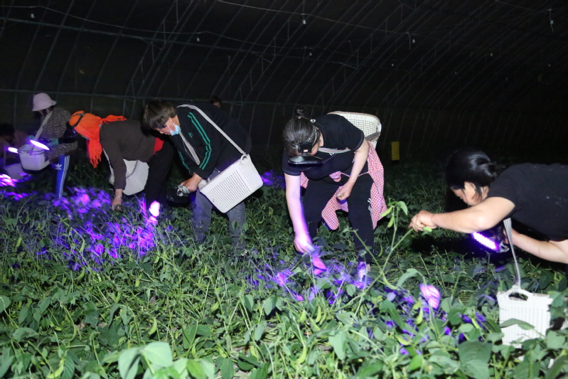 5月12日夜間,在崗埠農場高效農業示范園一處豆丹養殖基地,工作人員利用紫光燈在黑夜里收獲豆丹成蟲。當前正是豆丹大量上市的時節,當地搶抓農時,加緊收獲豆丹成蟲供應市場。