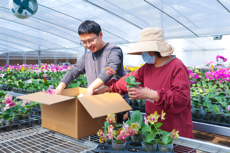 日前,云臺農場蝴蝶蘭種植溫室內一片繁忙景象,工作人員正有條不紊地將1500株精心培育的蝴蝶蘭苗打包裝箱。