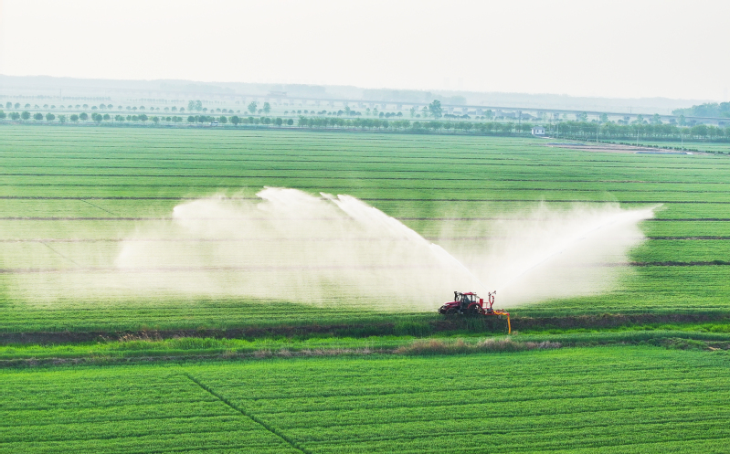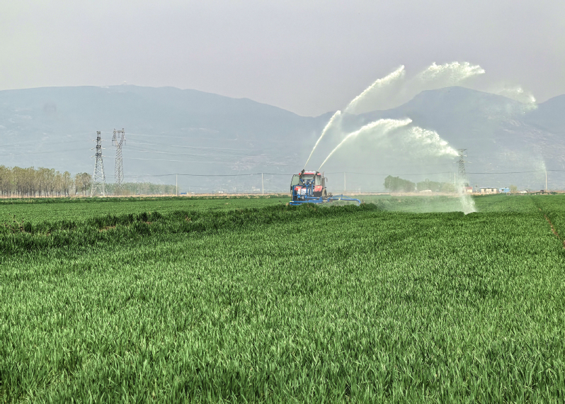 當前正值小麥拔節孕穗關鍵期,面對近期持續少雨天氣,蘇墾農發東辛分公司搶抓農時,組織農業生產區積極做好抗旱保苗等工作。小麥田里,一臺臺拖拉機搭載著專業灌溉設備,結合苗情、墑情分片分區科學澆水,水流均勻地灑落在嫩綠的麥苗間,一道道弧形水幕精準覆蓋農田。