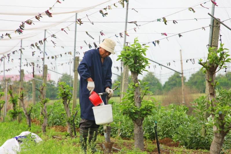 江心沙農場果農運用一體式施肥器進行穴施作業,為新栽種梨樹提供充足養分,促進枝葉生長。據了解,該方式適合于春季和夏季,能確保肥料均勻分布,有利于根系吸收,減少養分流失。