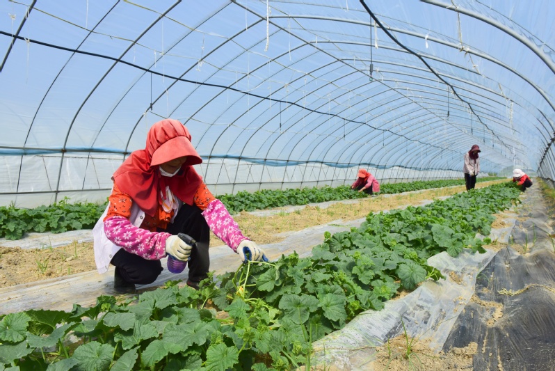 走進淮海農場高效種植園,大棚內一株株青翠欲滴的甜瓜苗郁郁蔥蔥,一朵朵黃燦燦的小花競相綻放、長勢喜人。目前正值授粉關鍵期,工人們在棚內來回穿梭,精心授粉,為今年的豐收打好基礎。據了解,農場采用“羊肚菌+甜瓜”的輪作模式,利用種植菌菇改良后的土壤栽種甜瓜,達到提升甜瓜品質,一棚兩收、激活土地效益的目的。